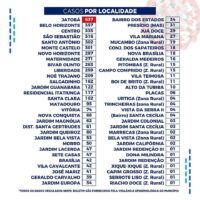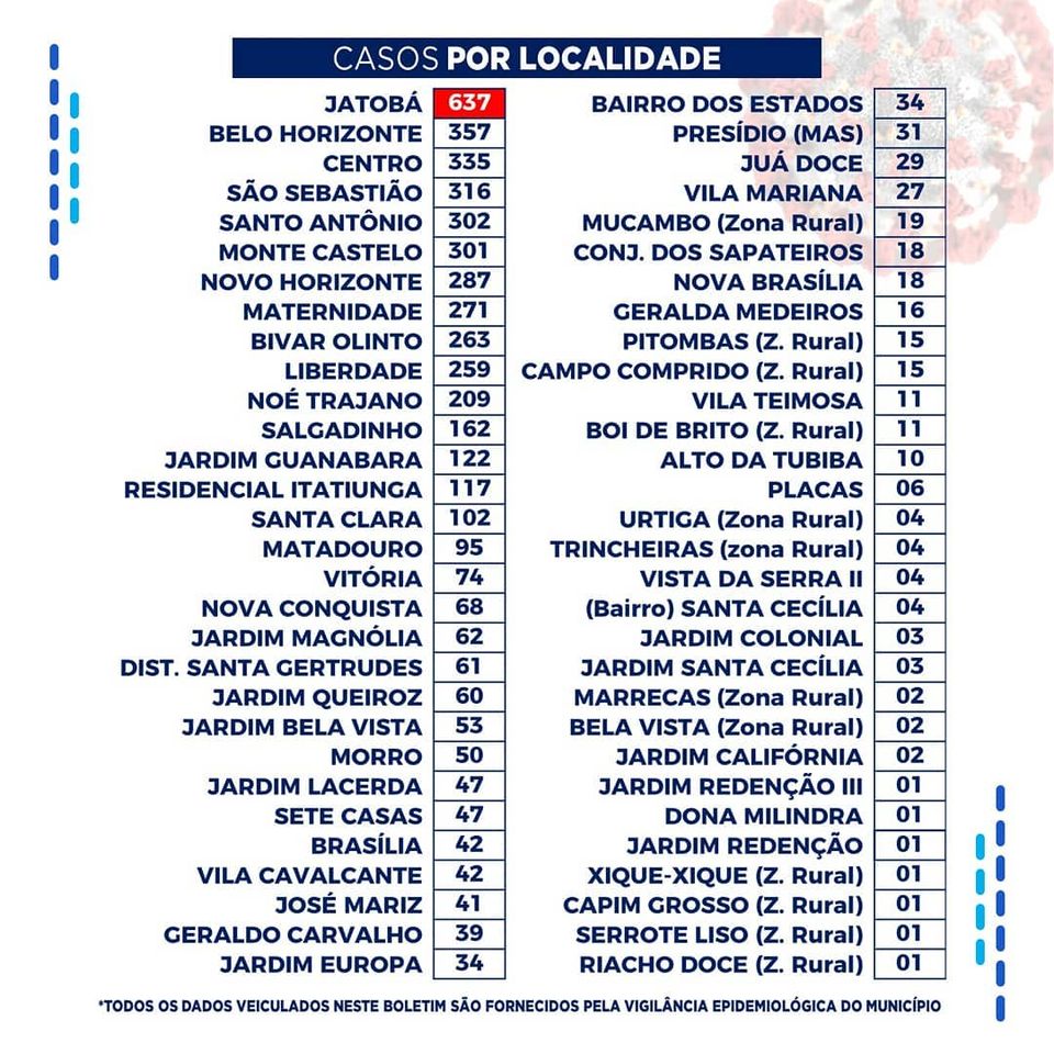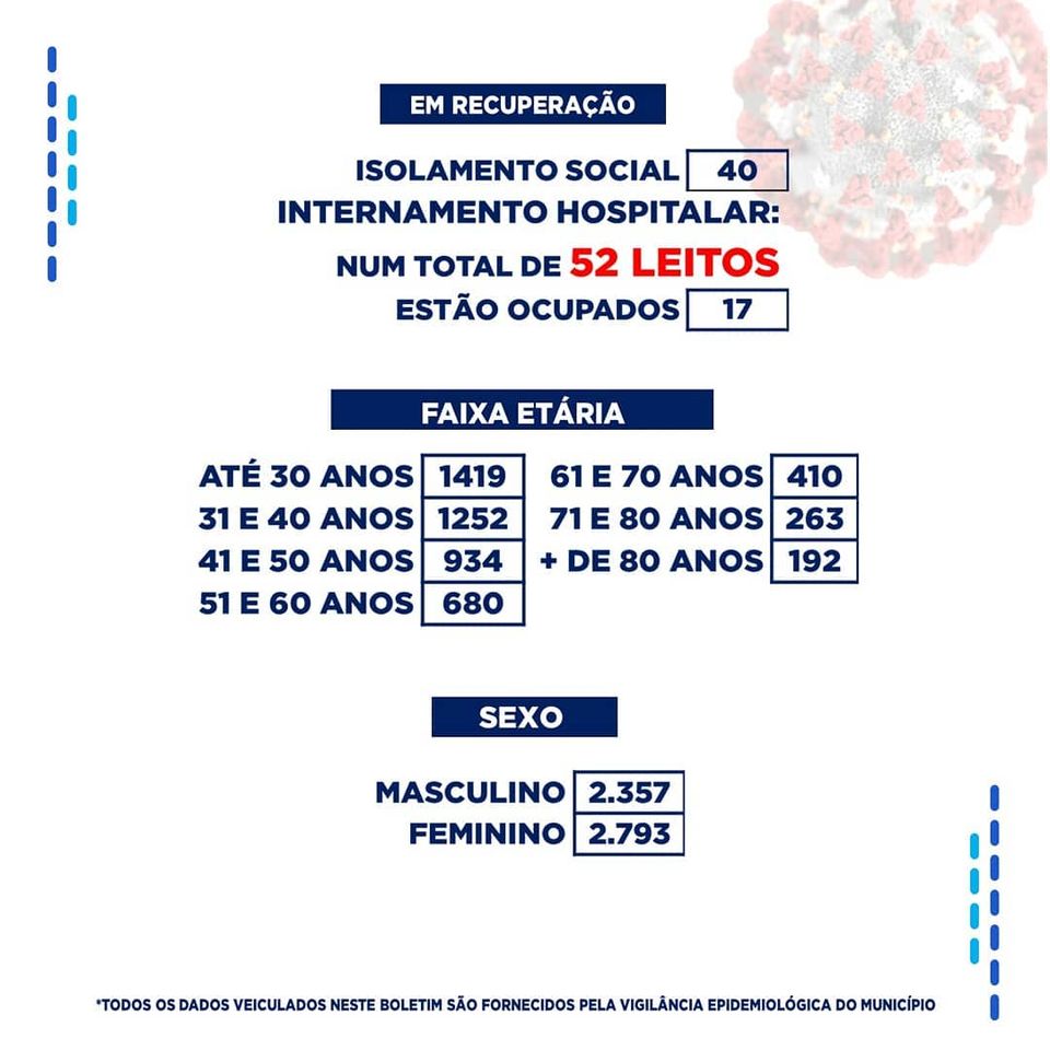 No levantamento feito dos leitos hospitalares, dos 52 disponíveis, 17 estão ocupados. Dos registros de infectados feitos por localidade, o bairro do Jatobá segue na frente com 637 casos. Por gênero, o sexo feminino segue na frente com 2.793 casos, e na faixa etária até 40 anos foram registrados 2.671 casos.