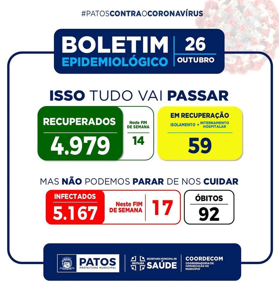 A Vigilância Epidemiológica da Secretaria de Saúde de Patos divulgou nesta segunda-feira, dia 26 de outubro, que a Capital do Sertão registrou neste fim de semana, 14 recuperados, e 17 novos casos da Covid-19.