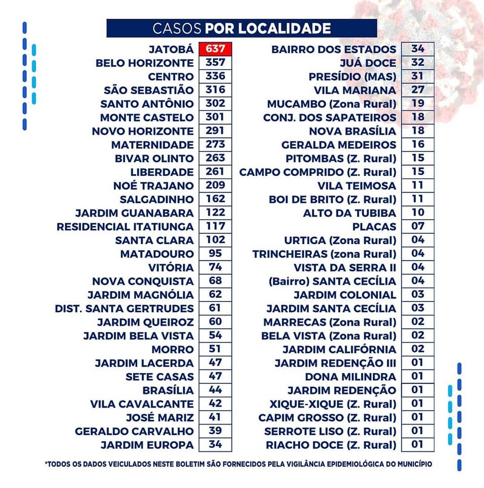 No levantamento feito dos leitos hospitalares, dos 52 disponíveis, 15 estão ocupados. Dos registros de infectados feitos por localidade, o bairro do Jatobá segue na frente com 637 casos. Por gênero, o sexo feminino segue na frente com 2.805 casos, e na faixa etária até 40 anos foram registrados 2.680 casos.