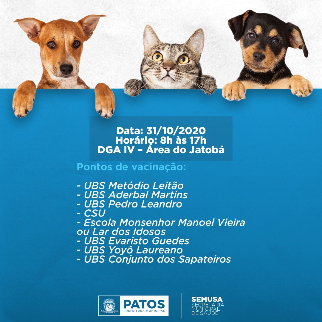 O quinto e último Dia D de vacinação antirrábica na cidade de Patos, acontecerá nos bairros da área do Jatobá, na zona sul, no próximo sábado, dia 31 de outubro.