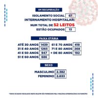 No levantamento feito dos leitos hospitalares, dos 52 disponíveis, 13 estão ocupados. Dos registros de infectados feitos por localidade, o bairro do Jatobá segue na frente com 646 casos. Por gênero, o sexo feminino segue na frente com 2.833 casos, e na faixa etária até 40 anos foram registrados 2.704 casos.