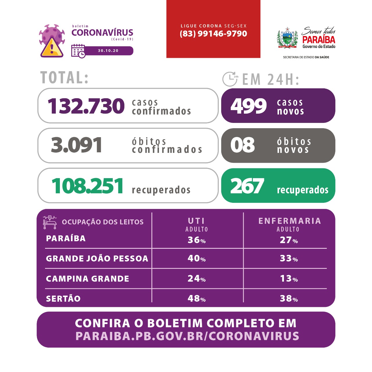 Os dados epidemiológicos com informações sobre todos os municípios e ocupação de leitos estão disponíveis em: www.paraiba.pb.gov.br/coronavirus.