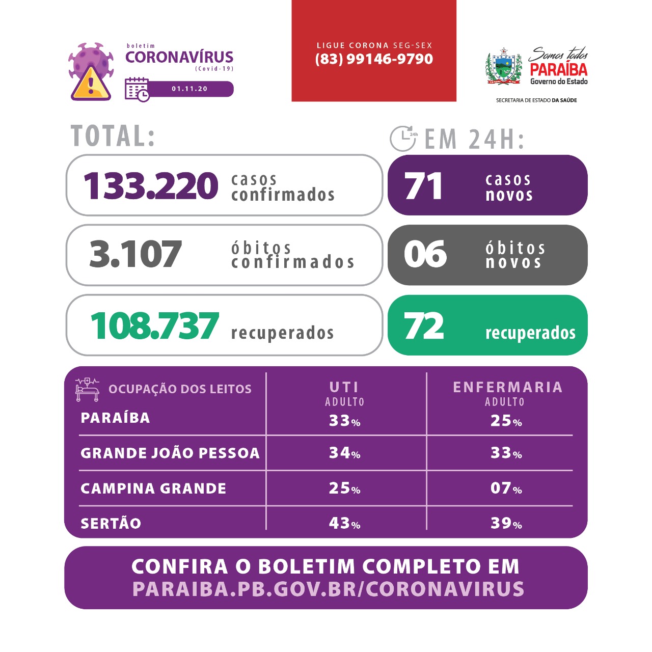 Os dados epidemiológicos com informações sobre todos os municípios e ocupação de leitos estão disponíveis em: www.paraiba.pb.gov.br/coronavirus.