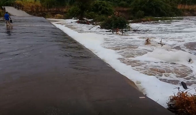O Rio Aguiar, que leva água para a Barragem de Mãe D’água, amanheceu em cheia. Veja vídeo: