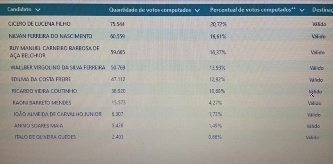 Em 3º lugar, ficou Ruy Carneiro, com 16,37% dos votos computados.