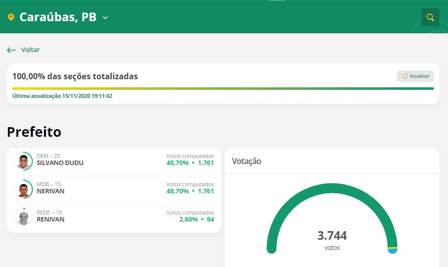 Ao todo foram registrados 3.744 votos. Pelo critério, o mais velho assume a vaga de prefeito. Silvano Dudu foi eleito prefeito da cidade em 2016, conforme dados apurados pelo ClickPB, a partir de dados do DivulgaCand, do tribunal Superior Eleitoral (TSE).