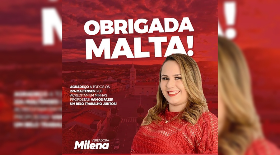 Estreando na política de Malta, na Região Metropolitana de Patos, candidata pela primeira vez, Milena Fontes, filha do Secretário de Administração daquela cidade, Diafrânio Fontes, foi uma das vereadoras eleitas nas eleições municipais do último domingo (15). Após as comemorações da vitória tanto dela quanto do novo prefeito Igor Rosa, Milena trouxe na tarde desta terça-feira, um agradecimento nas redes sociais. “Agradeço a todos os 224 malteneses que acreditaram em minhas propostas. Vamos fazer um belo trabalho juntos”, diz a mensagem colocada em um banner nas redes sociais.
