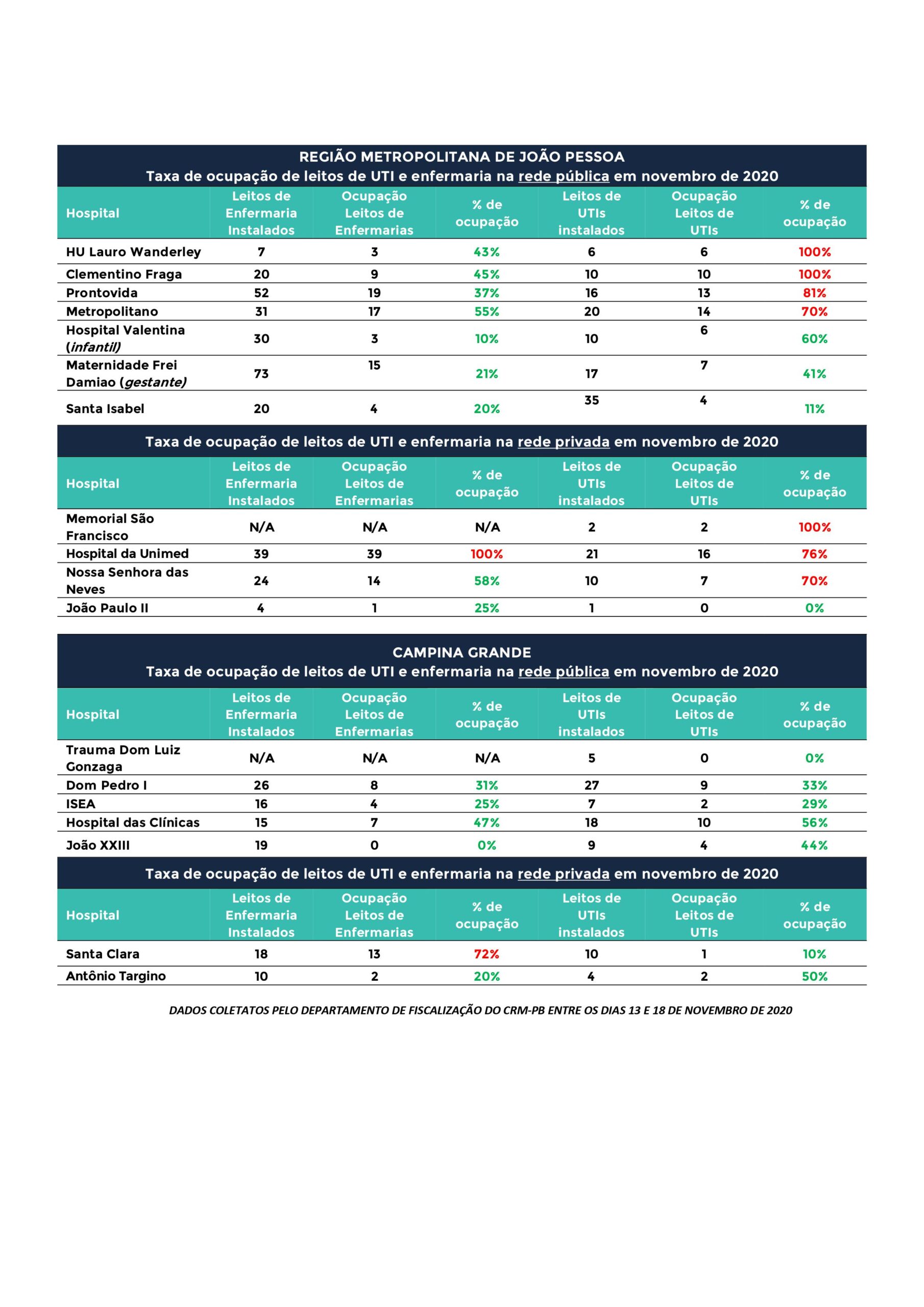 De acordo com o relatório do CRM-PB, o Complexo Hospitalar Clementino Fraga estava com 100% de ocupação dos leitos de UTI; o Hospital Universitário Lauro Wanderley com 100%; o Prontovida com 81%; e o Hospital Metropolitano com 70%. Apenas o Hospital Santa Isabel tinha ocupação de 11%. A Maternidade Frei Damião, exclusiva para gestantes com Covid, estava com a ocupação de 41% e o Hospital do Valentina, exclusivo para crianças, estava com a ocupação de 60% nos leitos de UTI.
