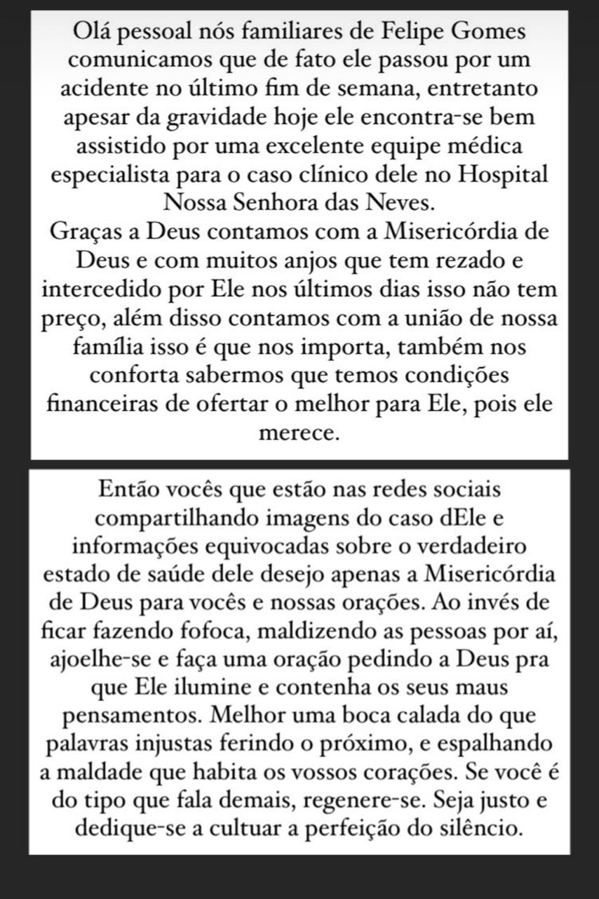 Na manhã desta quarta-feira (25), familiares do jovem Felipe Gomes, vulgo Felipe Madeira, entrou em contato com nossa redação para confirmar o acidente pelo qual o mesmo foi acometido no último final de semana, entretanto apesar da gravidade, ele se encontra bem assistido por uma excelente equipe médica do Hospital Nossa Senhora das Neves, especialistas no caso clínico dele. “Contamos com a misericórdia de Deus e com a intercessão de diversos anjos que tem orado pela reabilitação dele, e esse carinho não tem preço, além disso contamos com a união de nossa família, e isso é de total importância. Por fim, agradecemos por ter condições de ofertar o melhor para ele, pois ele merece”, afirmou um de seus familiares.