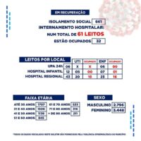 No levantamento feito pela Vigilância Epidemiológica, 661 pessoas estão em isolamento domiciliar, e dos 61 leitos hospitalares disponíveis, 32 estão ocupados. Confira no relatório geral os leitos detalhados por locais.