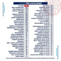 Dos registros de infectados feitos por localidade, o bairro do Jatobá segue na frente com 706 casos. Por gênero, o sexo feminino segue na frente com 3.448 casos, e na faixa etária até 40 anos foram registrados 3.213 casos.