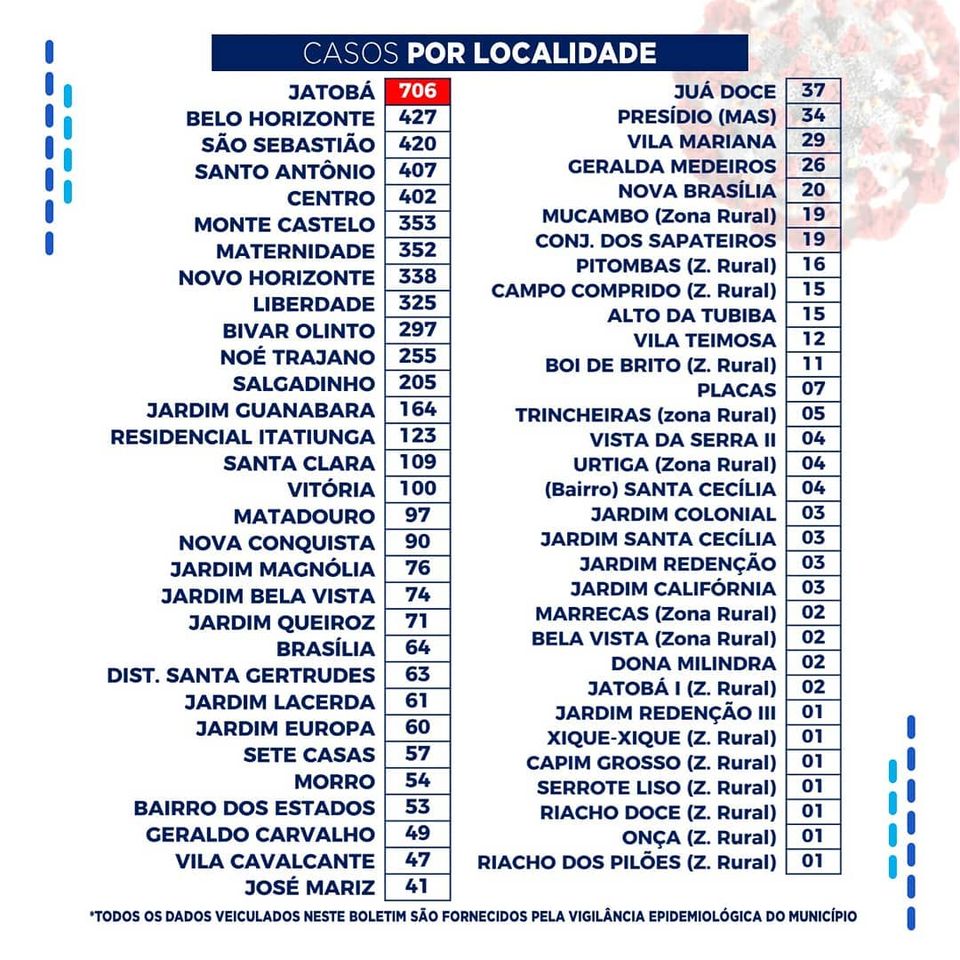 Dos registros de infectados feitos por localidade, o bairro do Jatobá segue na frente com 706 casos. Por gênero, o sexo feminino segue na frente com 3.448 casos, e na faixa etária até 40 anos foram registrados 3.213 casos.