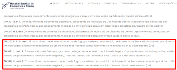 Segundo o posto policial do Hospital de Trauma, os três suspeitos que foram socorridos pelas viaturas da PM não resistiram e morreram no hospital.