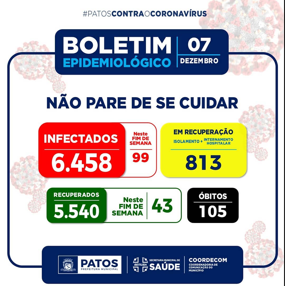 A Vigilância Epidemiológica da Secretaria de Saúde de Patos divulgou nesta segunda-feira, dia 07 de dezembro, que a Capital do Sertão registrou neste fim de semana, 43 recuperados, e 99 novos casos da Covid-19.
