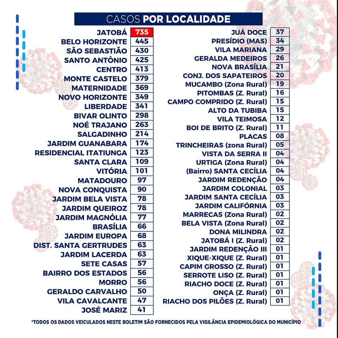 Dos registros de infectados feitos por localidade, o bairro do Jatobá segue na frente com 735 casos. Por gênero, o sexo feminino segue na frente com 3.575 casos, e na faixa etária até 40 anos foram registrados 3.314 casos.