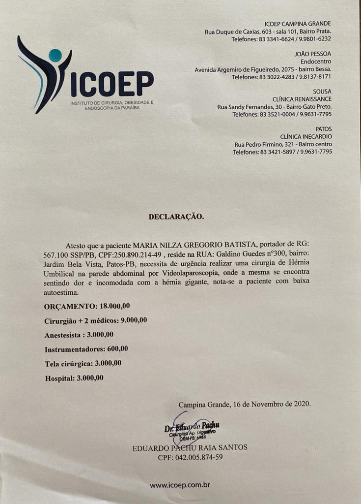 No dia 30 de Setembro desse ano após uma consulta com um especialista em cirurgia na região do abdômen e depois de uma bateria de exames realizados em outubro e novembro passados, foi apontado a indicação cirúrgica para ser realizada o mais rápido possível. O procedimento custa 18 mil reais.