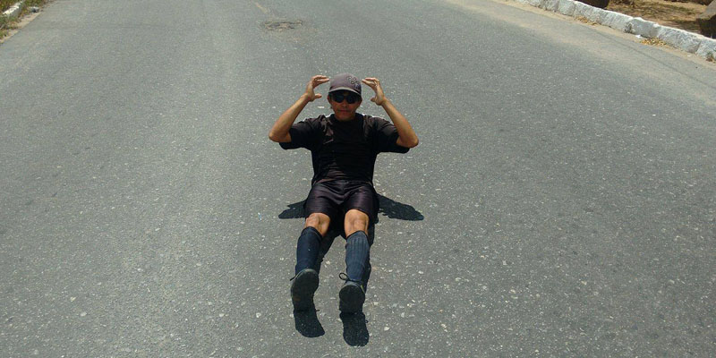 Magia, que é morador da Rua São Cristóvão, no Bairro Jatobá, se veste de preto e caminha, corre e faz prática de diversos exercícios no asfalto quente, pior que panela de pressão, muitas das vezes com temperatura acima dos 50º.