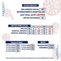No levantamento feito pela Vigilância Epidemiológica, 981 pessoas estão em isolamento domiciliar, e dos 61 leitos hospitalares disponíveis, 32 estão ocupados. Confira no relatório geral os leitos detalhados por locais.