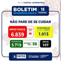 A Vigilância Epidemiológica da Secretaria de Saúde de Patos divulgou nesta terça-feira, dia 15 de dezembro, que a Capital do Sertão registrou nas últimas 24h, 58 recuperados, e 46 novos casos da Covid-19.