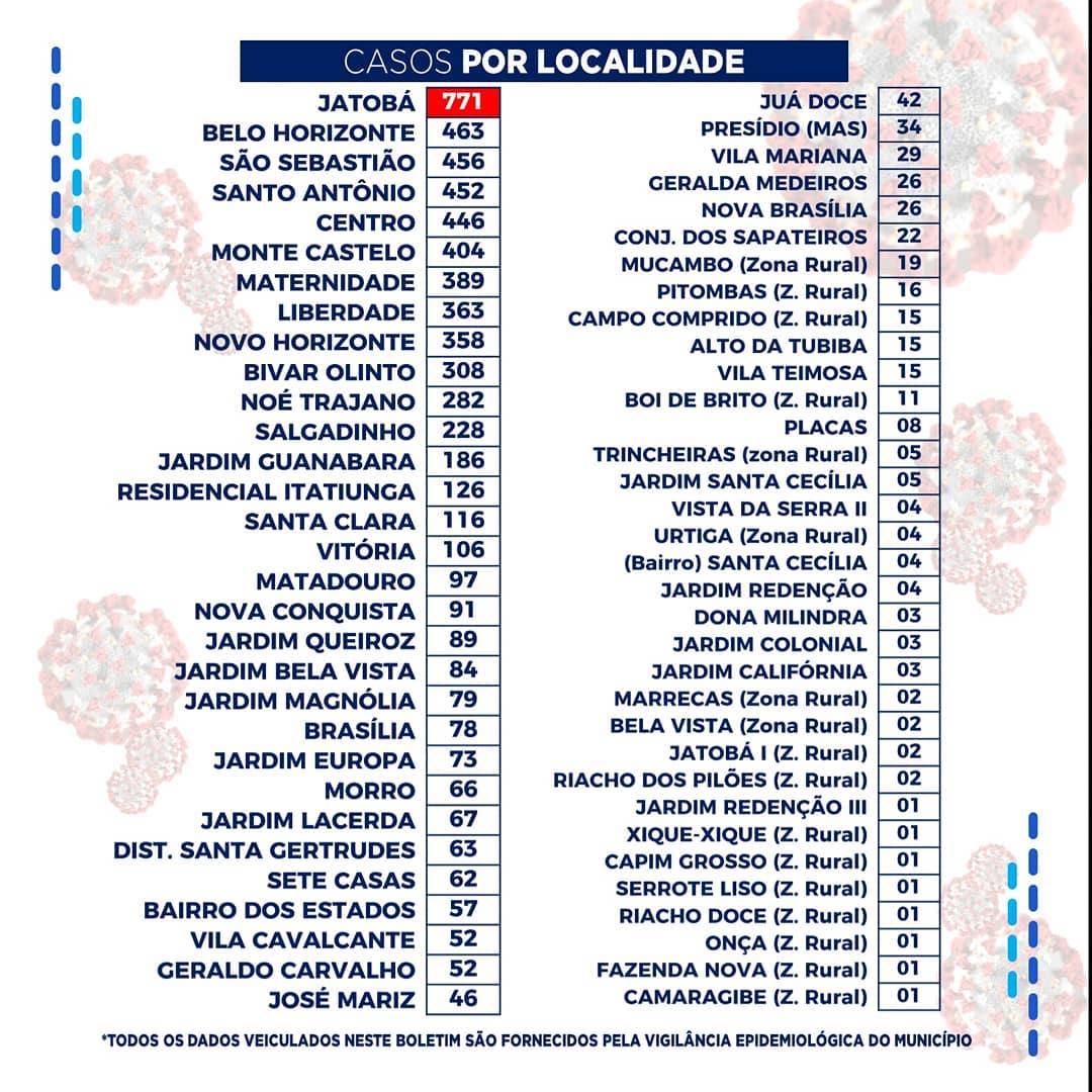 Dos registros de infectados feitos por localidade, o bairro do Jatobá segue na frente com 771 casos. Por gênero, o sexo feminino segue na frente com 3.790 casos, e na faixa etária até 40 anos foram registrados 3.514 casos.