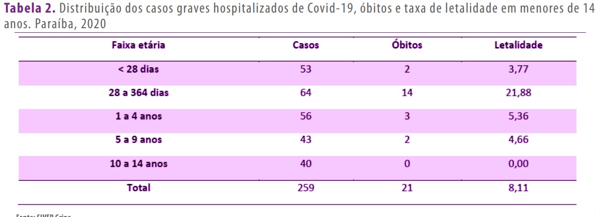 A pandemia da Covid-19 já atingiu 5575 crianças de até 9 anos na Paraíba, matando 21 crianças e adolescentes com até 14 anos de idade. Os dados registrados no Boletim da Secretaria de Saúde desta terça-feira (15) que foram analisado pelo ClickPB também revelam que, das 10 crianças com a Síndrome Pediátrica, duas bebês morreram em consequência do vírus em João Pessoa e Cruz do Espírito Santo.