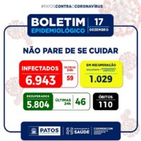 A Vigilância Epidemiológica da Secretaria de Saúde de Patos divulgou nesta sexta-feira, dia 17 de dezembro, que a Capital do Sertão registrou nas últimas 24 horas, 46 recuperados, e 59 novos casos da Covid-19.