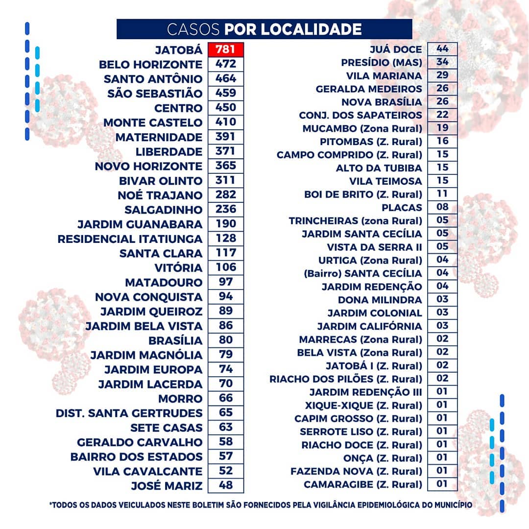 Dos registros de infectados feitos por localidade, o bairro do Jatobá segue na frente com 781 casos. Por gênero, o sexo feminino segue na frente com 3.842 casos, e na faixa etária até 40 anos foram registrados 3.565 casos.