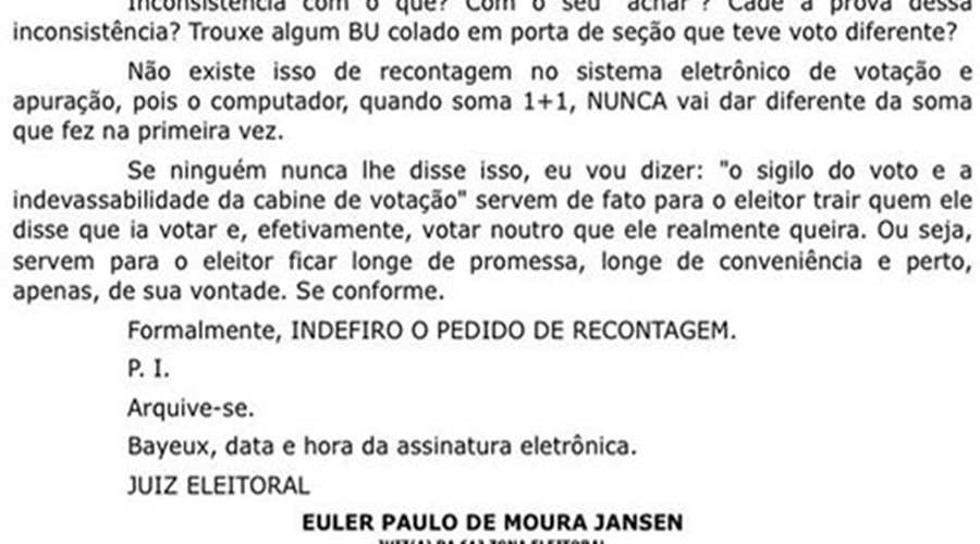 O juiz deixou claro, ainda, que não há possibilidade de recontagem de votos. “Pois o computador, quando soma 1 + 1, NUNCA vai dar diferente da soma que fez na primeira vez”, reforçou.