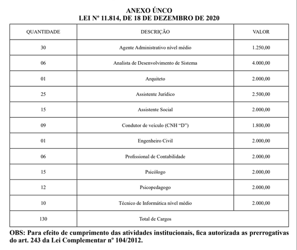 Os salários vão de R$ 1.250 a R$ 4 mil. O recrutamento de pessoal a ser contratado poderá ser feito através de processo de seleção simplificada de comprovação de experiência do profissional e/ou análise curricular, prescindindo, portanto, de concurso público, caso caracterizar-se por serviços continuados.