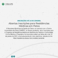 A Secretaria Municipal de Saúde de Patos, em parceria com o Centro Universitário de Patos (UNIFIP) abriu inscrições para o Programa de Residência Médica em Medicina de Família e Comunidade, Clínica Médica e Psiquiatria. As inscrições podem ser feitas até o dia 18 de janeiro de 2021 e exclusivamente por meio eletrônico, através do link https://residencia.studus.com.br/edital-residente.?