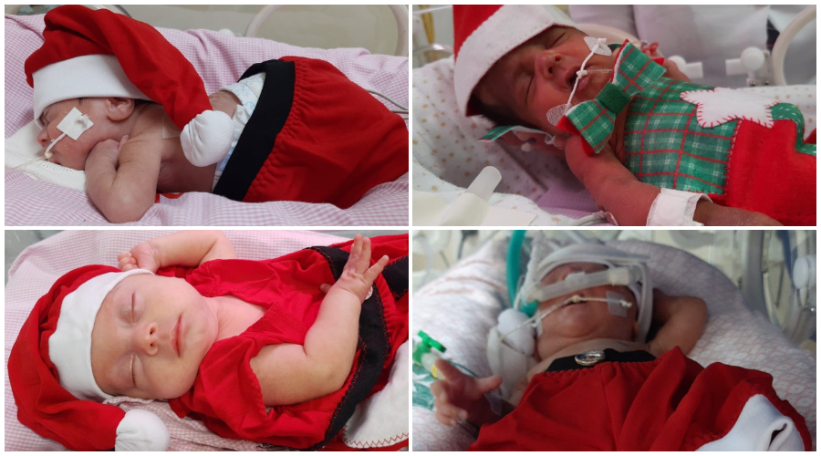 As roupas foram produzidas em tecidos confortáveis e esterilizáveis, nas cores do Natal. Segundo a assessoria, aqueles que já podem ir ao colo foram segurados por suas mães para fotos especiais.
