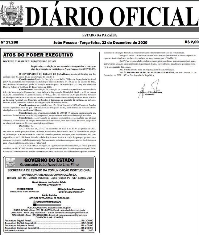 O Governo da Paraíba emitiu novo decreto para disciplinas as atividades comerciais em meio à pandemia do novo coronavírus. Ficou estabelecido que os bares e restaurantes da Paraíba só poderão funcionar até 15 horas na véspera e dia de Natal e Ano Novo.