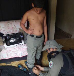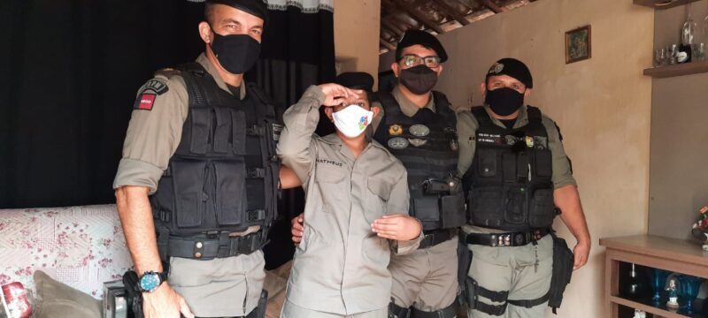 Os comandantes fizeram questão de entregar pessoalmente, nesta quarta-feira (23), a farda e uma cesta básica a Matheus. O pequeno vibrou, quando os policiais chegaram a sua casa e de pronto, logo se vestiu e prestou continência a tropa.