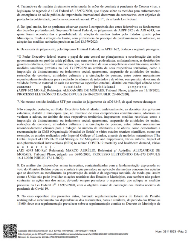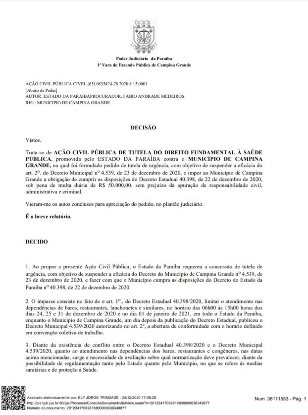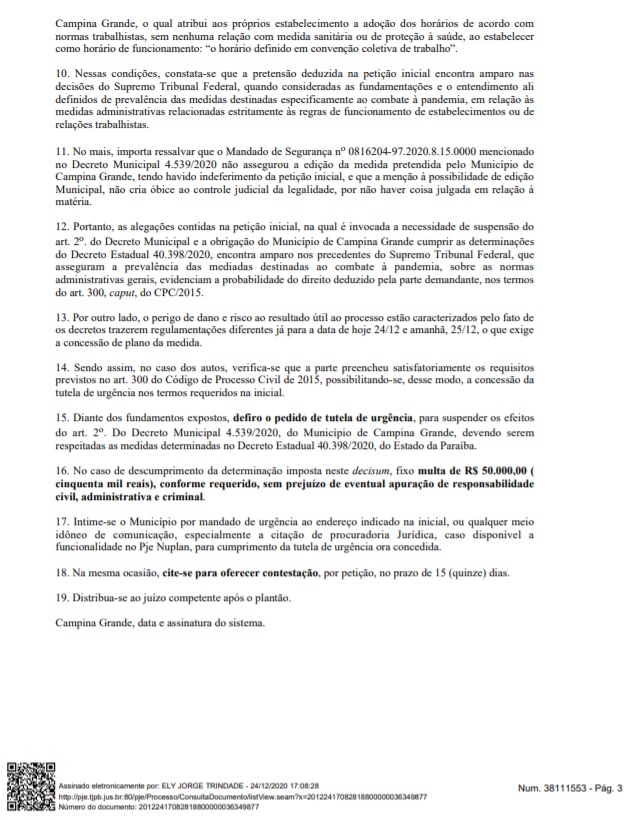 Na decisão, o juiz Ely Jorge Trindade destacou o respeito ao Decreto Estadual 40.398/2020. “Diante dos fundamentos expostos, defiro o pedido de tutela de urgência, para suspender os efeitos do art. 2o. Do Decreto Municipal 4.539/2020, do Município de Campina Grande, devendo serem respeitadas as medidas determinadas no Decreto Estadual 40.398/2020, do Estado da Paraíba.”