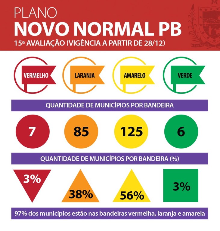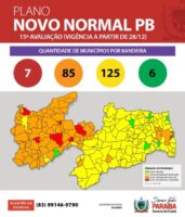 O estudo ilustra, dentro da comparação com a 11ª semana, uma redução expressiva da participação da bandeira amarela, de 80% para 56% dos municípios paraibanos, e um largo crescimento da bandeira laranja, passando de 6% para 38%. Houve ainda uma redução proporcional dos municípios em bandeira verde (mobilidade normal), caindo de 14% para 3%, além do crescimento de 11% da participação dos municípios em bandeiras vermelha (mobilidade impedida), amarela e laranja, que agora predominam em 97% dos municípios da Paraíba.