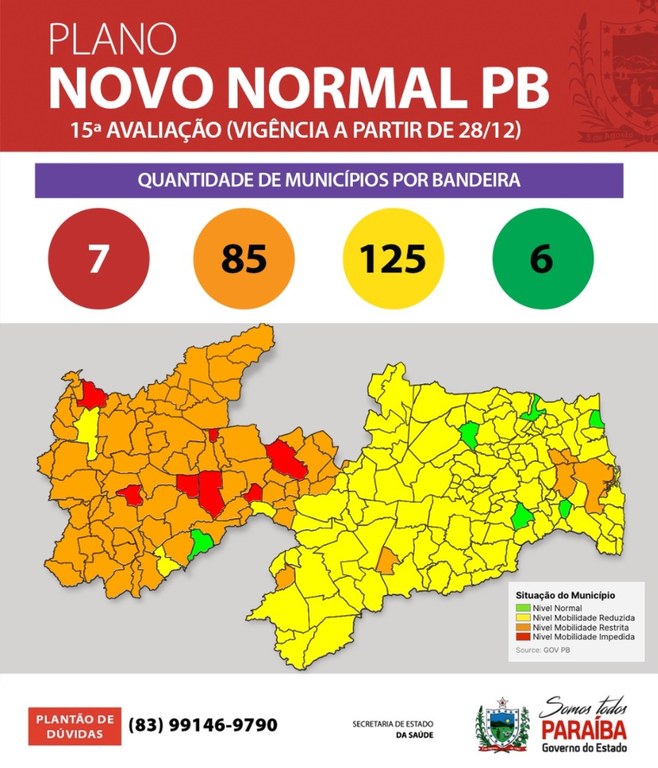 A análise da 15ª avaliação do Plano Novo Normal mantém a recomendação de máxima atenção dos gestores e autoridades sanitárias municipais no sentido de garantir o monitoramento efetivo dos indivíduos com sintomas gripais e recomenda a testagem dos sintomáticos através do SWAB nasal, além de alertar para riscos reais e sustentados de crescimento persistente dos números de casos, internações hospitalares e óbitos nas próximas duas quinzenas, no Estado da Paraíba. As informações completas, bem como os protocolos sanitários, estão disponíveis no site: https://paraiba.pb.gov.br/diretas/saude/coronavirus/novonormalpb