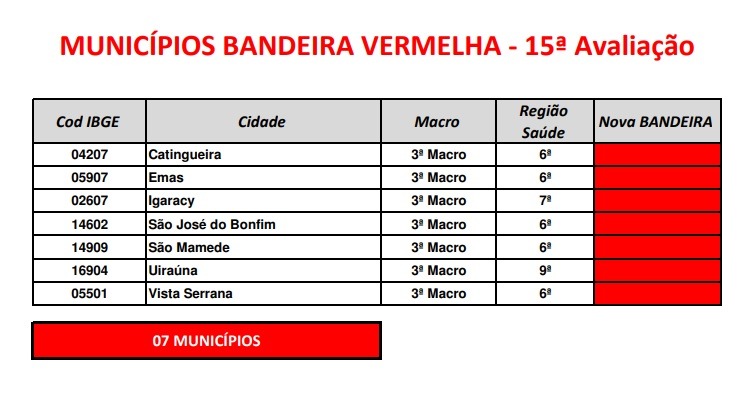 Catingueira, Emas, São José do Bonfim, São Mamede e Vista Serrana, todos na Região Metropolitana de Patos, estão as sete cidades do Estado em bandeira vermelha, dentro da 15ª avaliação do Plano Novo Normal Paraíba divulgada neste sábado (26).