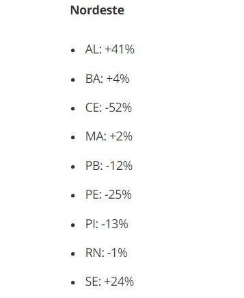 De acordo com o levantamento, a Paraíba registrou uma queda de 12% no número de mortes por coronavírus. Além dele, Rio Grande do Sul, Espírito Santo, Rio de Janeiro, São Paulo, Distrito Federal, Amapá, Tocantins, Bahia, Maranhão, Piauí e Rio Grande do Norte, também registraram estabilidade no número de mortes.