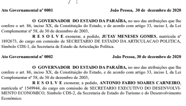 O governador da Paraíba, João Azevêdo, exonerou os secretários Jutay Menezes e Fábio Carneiro dos cargos de secretários que ocupavam na gestão estadual. A exoneração dos secretários foi publicada no Diário Oficial desta terça-feira (05).