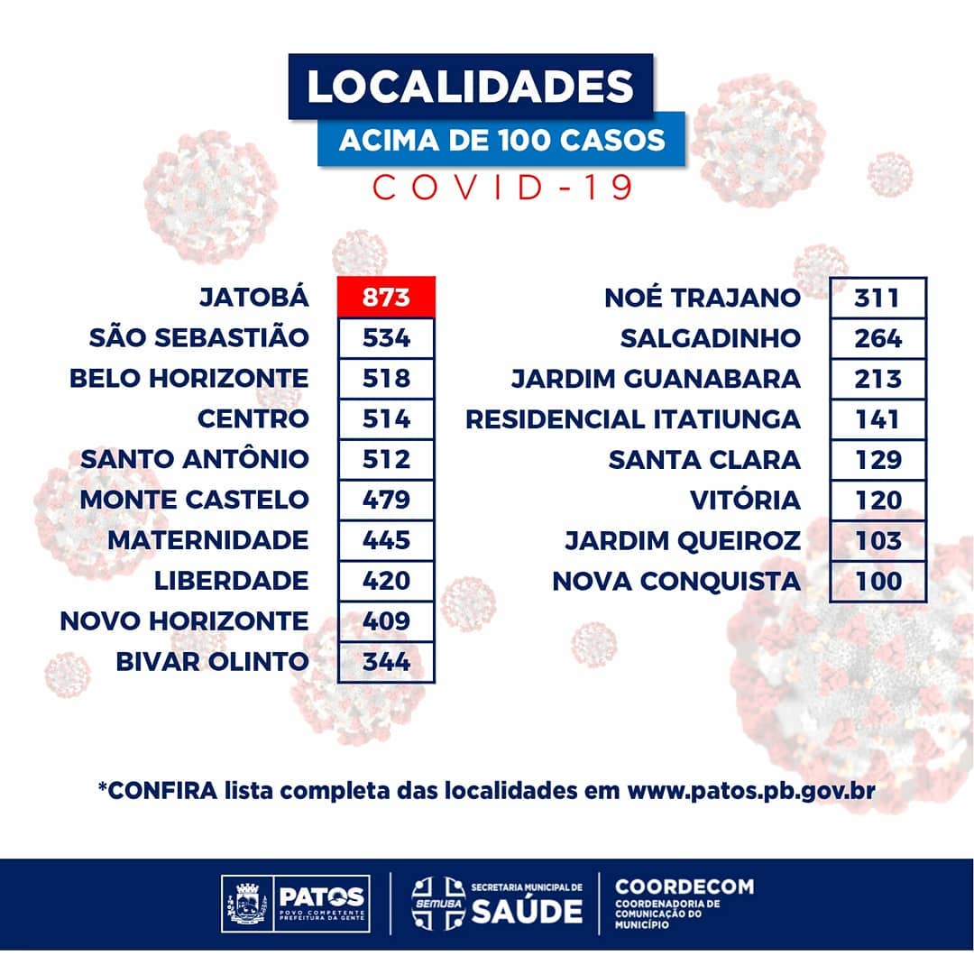 Dos registros de infectados feitos por localidade, o bairro do Jatobá segue na frente com 873 casos. Por gênero, o sexo feminino segue na frente com 4.313 casos, e na faixa etária até 40 anos foram registrados 4.008 casos.