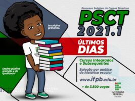 As inscrições para o Processo Seletivo 2021.1 de Cursos Técnicos do Instituto Federal da Paraíba -IFPB se encerram na próxima segunda-feira (11). Essa é a última oportunidade, pois não haverá prorrogação. São mais de 3.600 vagas em cursos técnicos integrados e subsequentes gratuitos e sem provas. O candidato precisa apenas efetuar a inscrição de forma online, preencher o formulário eletrônico e anexar o histórico escolar.