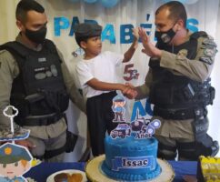 O garoto Issac, de 5 anos, foi surpreendido com um presente que ele pediu de olhos fechados em seu aniversário, no ano passado, com a presença do cabo Valter e do soldado Felizardo. Ele revelou aos policiais e nessa segunda-feira (11) a viatura chegou com o cabo Valter e o soldado Caio trazendo uma miniatura de farda, levando-o em seguida para ver como era por dentro uma viatura da PM.