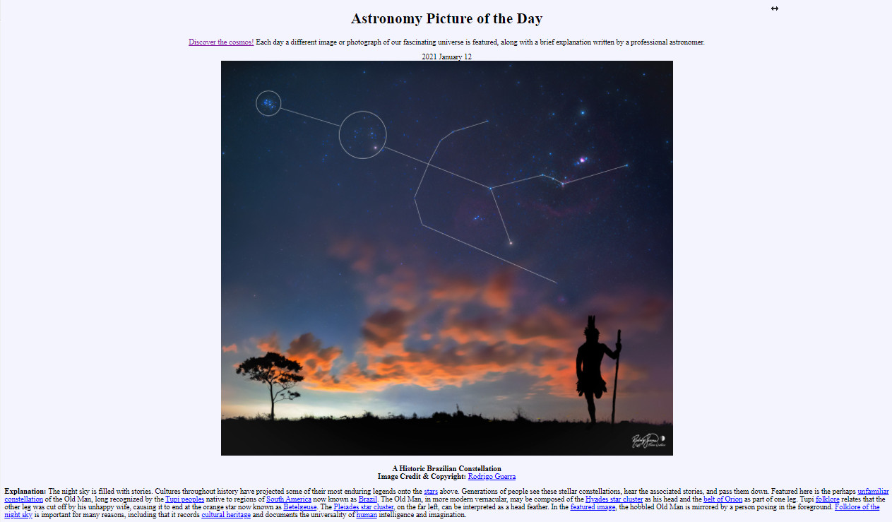 “O céu noturno está repleto de histórias. As culturas ao longo da história projetaram algumas de suas lendas mais duradouras nas estrelas do céu. Gerações de pessoas veem essas constelações estelares, ouvem as histórias associadas e as transmitem. Em destaque aqui está a constelação talvez desconhecida do Homem Velho, há muito reconhecida pelos povos Tupis nativos de regiões da América do Sul hoje conhecidas como Brasil. O Homem Velho, no vernáculo mais moderno, pode ser composto do aglomerado de estrelas de Hyades como sua cabeça e o cinturão de Orion como parte de uma perna. O folclore tupi relata que a outra perna foi cortada por sua esposa infeliz, fazendo com que terminasse na estrela laranja conhecida como Betelgeuse. O aglomerado de estrelas das Plêiades, na extremidade esquerda, pode ser interpretado como uma pena na cabeça. Na imagem em destaque, o Velho manco é espelhado por uma pessoa posando em primeiro plano. O folclore do céu noturno é importante por muitas razões, inclusive porque registra o patrimônio cultural e documenta a universalidade da inteligência e da imaginação humana.”
