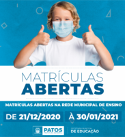 Pais ou responsáveis que desejam matricular seus filhos em uma das unidades escolares da Rede Municipal de Ensino de Patos para o ano letivo de 2021 têm até o dia 30 de janeiro para efetivar a inscrição do aluno. São ofertadas vagas nas 32 escolas na zona urbana, seis escolas na zona rural, 12 creches, quatro polos de Educação de Jovens e Adultos (EJA), além do Centro Irmã Benigna.