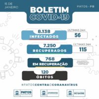 A Vigilância Epidemiológica da Secretaria de Saúde de Patos, divulgou nesta sexta-feira, dia 15 de janeiro, que a Capital do Sertão registrou nas últimas 24h, 115 recuperados, e 56 novos casos da Covid-19.