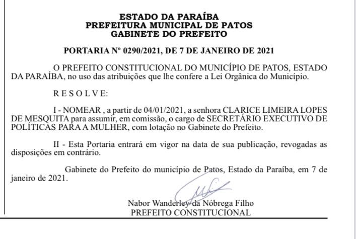 O prefeito também já havia nomeado no mesmo D.O a advogada Clarice Limeira Lopes de Mesquita para ocupar o cargo de secretária Executiva de Políticas Públicas para Mulher.