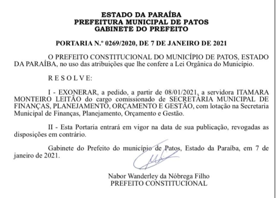 Por falar em mulher, o Diário trouxe a exoneração da Secretária de Finanças e Planejamento, Itamara Monteiro Leitão, a pedido.