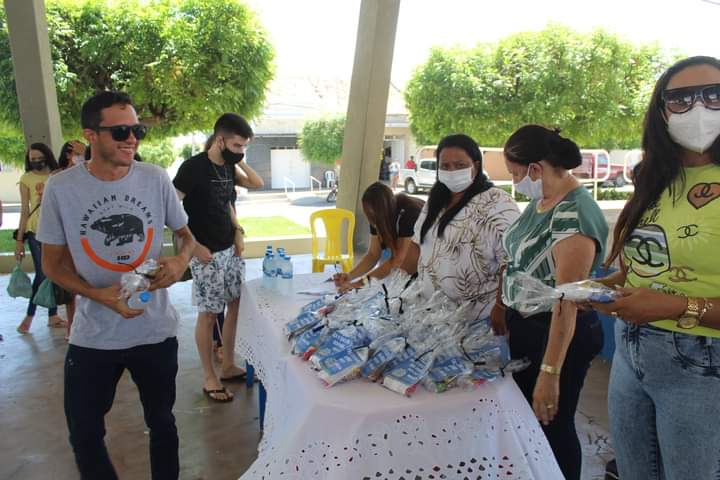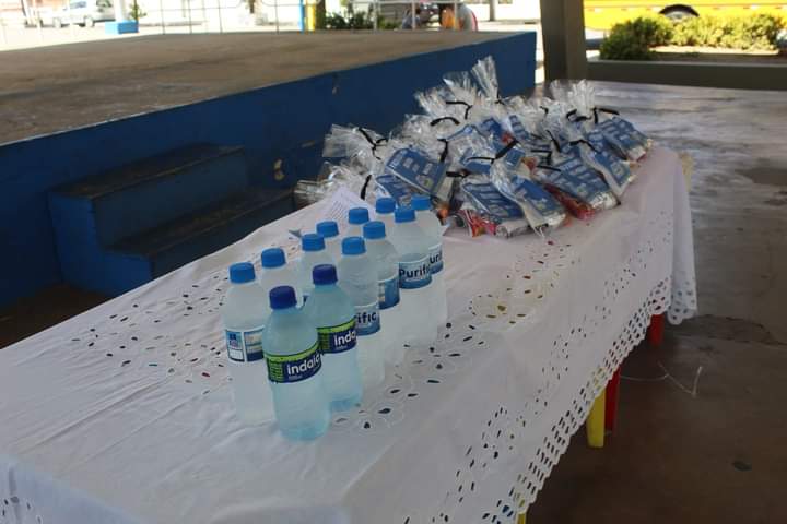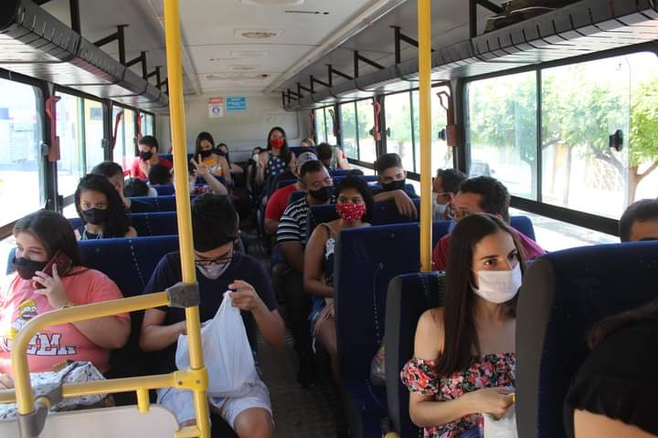 Além dos ônibus também foi ofertado um kit composto por caneta, máscara, álcool em gel, água e chocolate, que foram entregues no momento em que os alunos entraram nos ônibus.