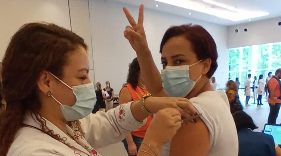 A técnica de enfermagem e graduanda em enfermagem, Amélia Cristina Ferreira Pereira de Lira, de 36 anos, foi a primeira teixeirense a receber a dose inicial da vacina contra a Covid-19.