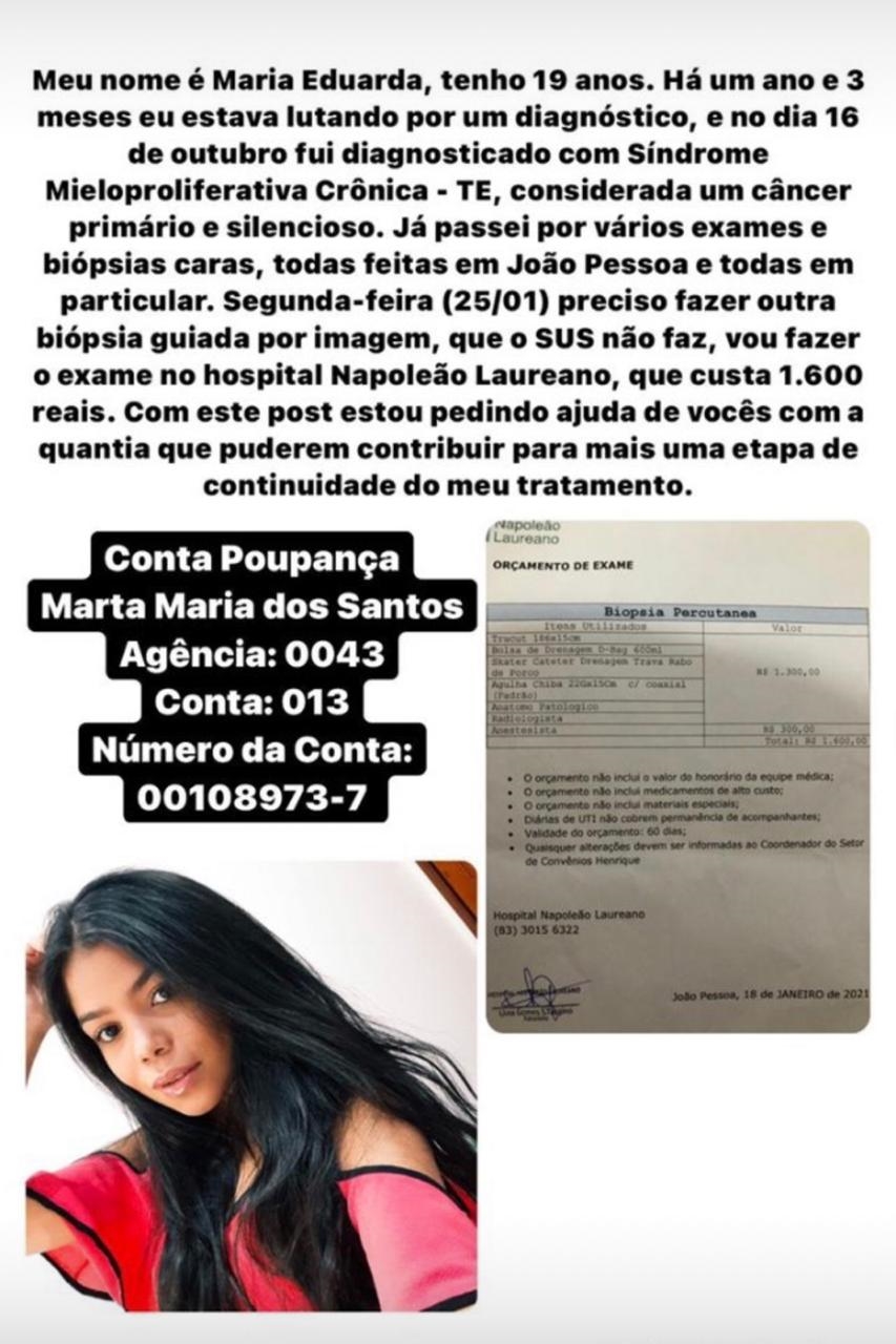 A jovem patoense Maria Eduarda, de 19 anos, há um ano e três meses está lutando por um diagnóstico. Em 16 de outubro de 2020, foi diagnosticada com Síndrome Mieloproliferativa Crônica, considerada um câncer primário e silencioso. Ela já passou por vários exames e biópsias caras, todas realizadas em João Pessoa.